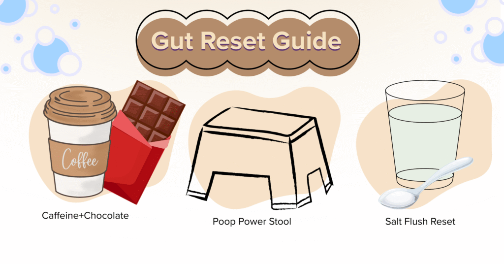 This position helps open up your hips, relax your pelvic floor, and align your colon to make pooping easier and faster. It’s a weird little hack, but don’t knock it till you try it — it’s giving low-effort, high-reward energy. Pair it with your Salt Flow Reset for a double win.